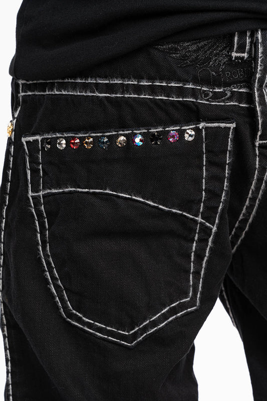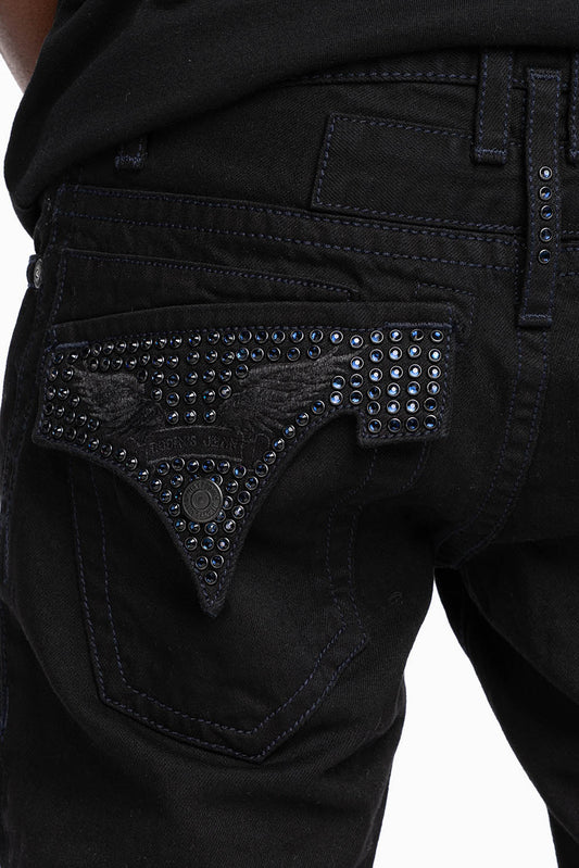 KILLER FLAP MENS STRAIGHT LEG JEAN IN PURE BLACK EMBELLISHED WITH SMOKEY TOPAZ CRYSTALS