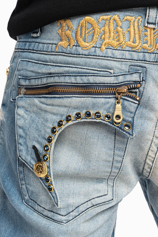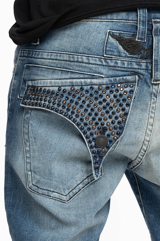 ZIPPER KILLER FLAP MENS JEANS IN ELROY MEDIUM WASH WITH X- LARGE CRYSTALS