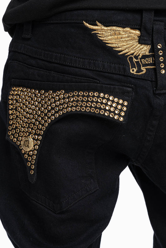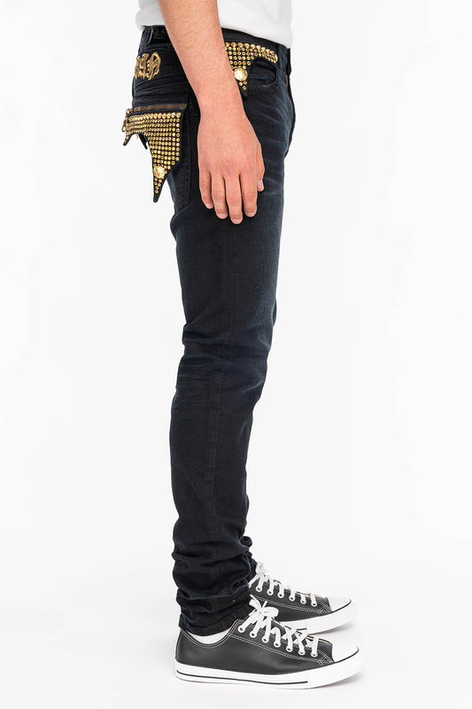 KILLER FLAP MENS SKINNY JEANS IN PURE BLACK WITH GOLD GOTHIC EMBROIDERY FULLY EMBELLISHED CRYSTALS