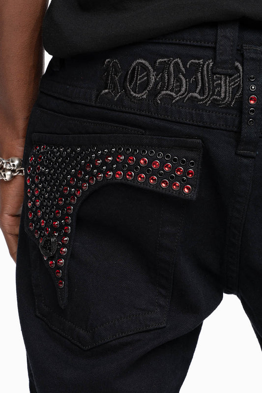 KILLER FLAP SKINNY JEANS FULLY EMBELISHED WITH CRYSTALS IN PURE BLACK WITH GOTHIC EMBROIDERY