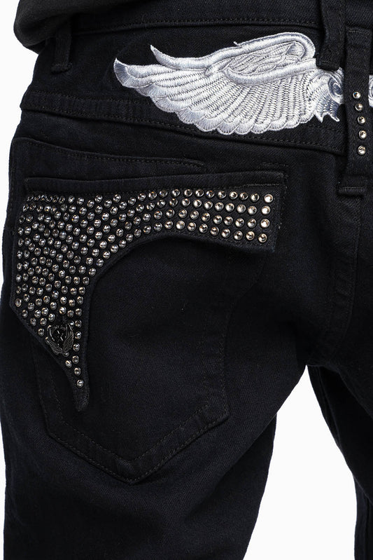KILLER FLAP MENS SKINNY JEANS IN PURE BLACK WITH SILVER WINGS AND FULL BLK DIAMOND CRYSTALS