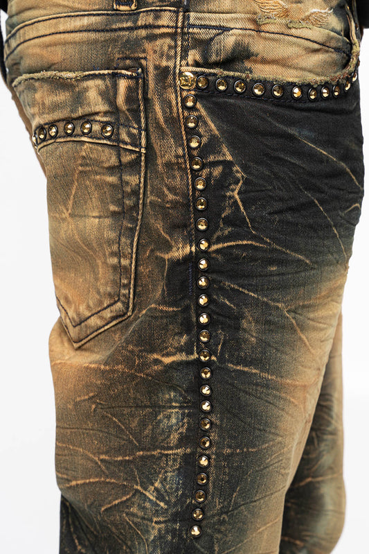 SKINNY MENS JEANS IN 4D DARK OXIDO BROKEN BACKING WASH WITH LARGE CRYSTALS & STUDS