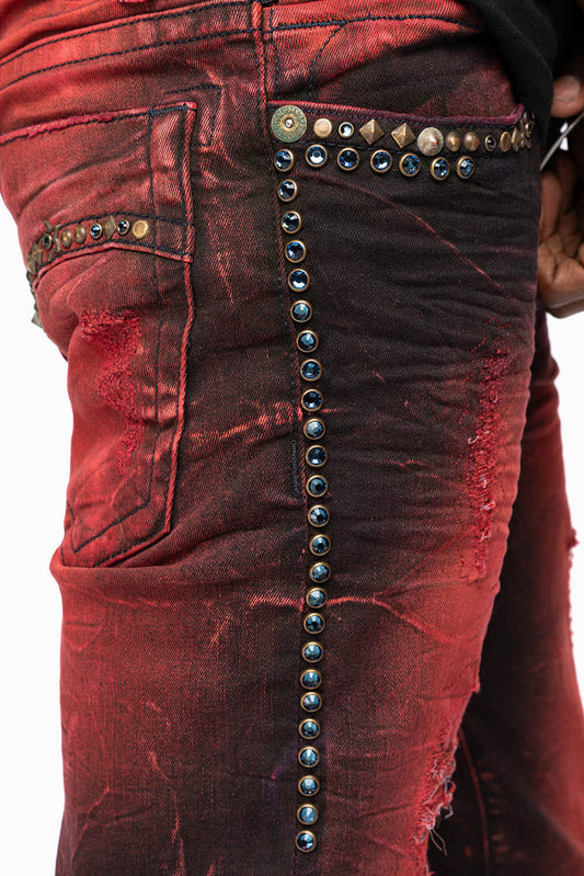 SKINNY MENS JEANS IN 4D DARK MALBEC BROKEN BACKING WASH WITH LARGE CRYSTALS & STUDS