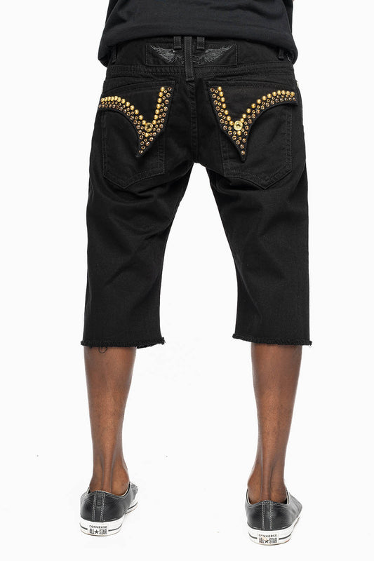 MENS SHORT WITH FLAP POCKETS IN PURE BLK WASH WITH SMOKEY TOPAZ CRYSTALS AND PARACHUTE STUDS