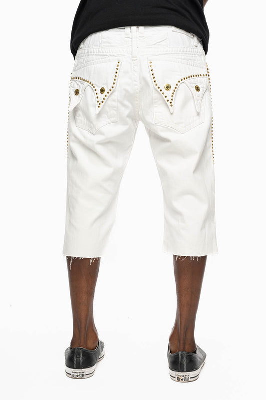 MENS DOUBLE FLAP DESTROYED SHORTS IN WHITE WASH WITH BLK DIAMOND CRYSTALS