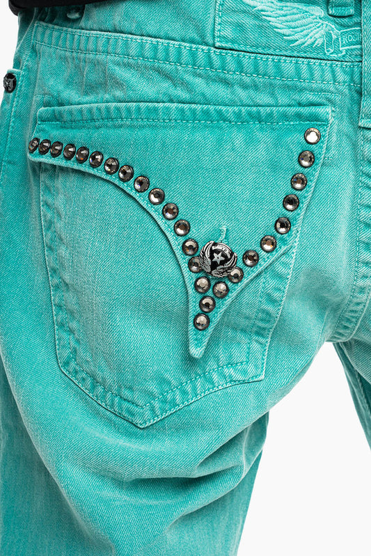 MENS SHORTS WITH KILLER FLAP POCKETS IN SULFUR TEAL WASH WITH XL BLK DIAMOND CRYSTALS