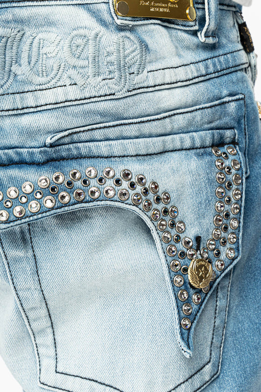 MENS STRAIGHT LEG JEAN IN OMAHA LIGHT BLUE WASH EMBELLISHED WITH CLEAR AND SAPPHIRE CRYSTALS