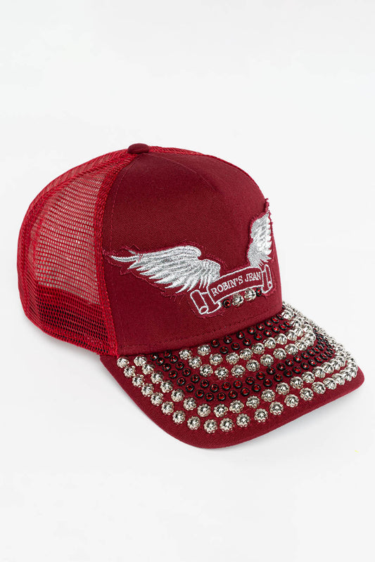 BURGUNDY TRUCKER HAT WITH RED CRYSTAL AND SILVER NAILHEAD EMBELLISHMENT