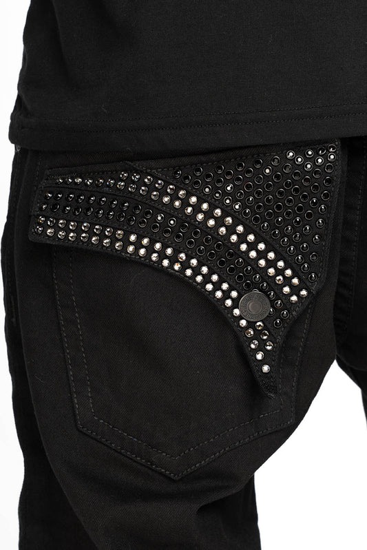 MENS LIMITED EDITION FLAP POCKET SLIM JEANS IN PURE BLK WASH WITH CRYSTALS