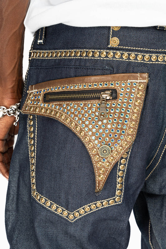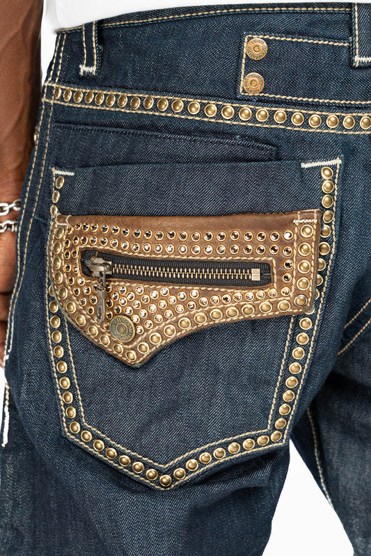 KILLER FLAP MENS STRAIGHT LEG JEAN IN OMAHA TAN BLUE WASH EMBELLISHED WITH JET BLK CRYSTAL