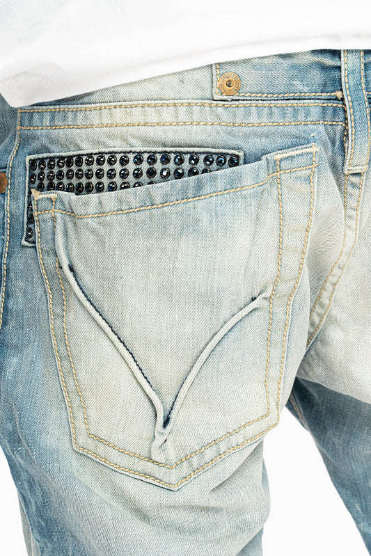 MENS LIMITED EDITION WARRIOR MILITARY JEAN- PANTS IN BLUE OMAHA LIGHT WASH WITH CRYSTALS
