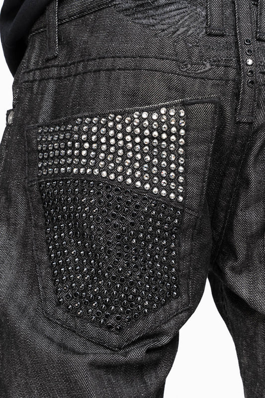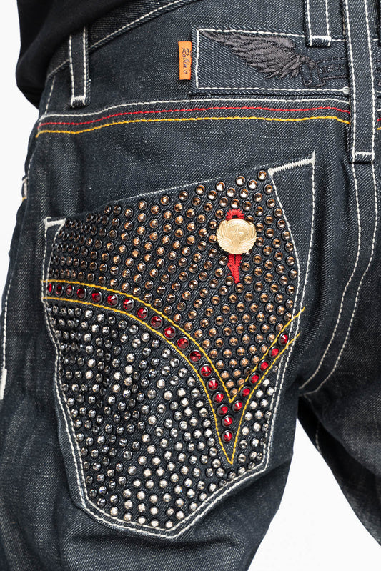 MENS CLASSIC STRAIGHT LEG LONG FLAP JEANS WITH MONTANA BLUE AND RED CRYSTALS IN PURE BLK
