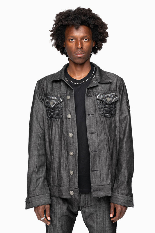 MOTORCYCLE CLUB DENIM JACKET IN BLK RAW DENIM WITH PATCHES STUDS AND CRYSTALS