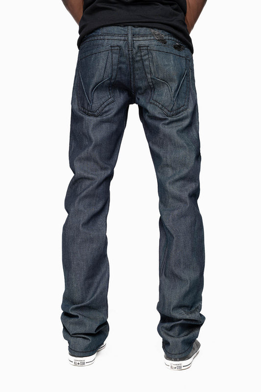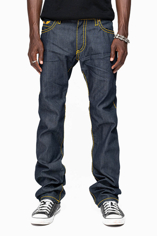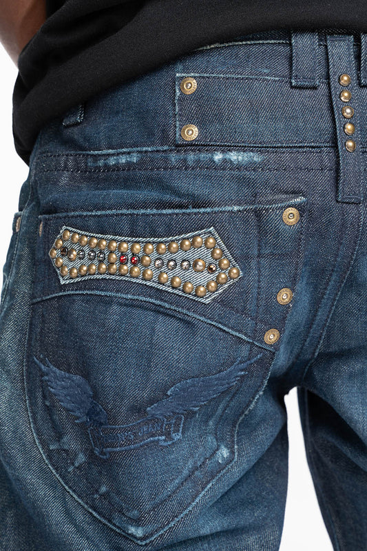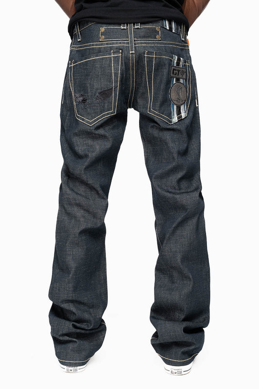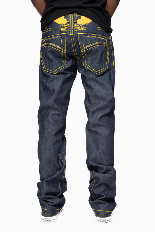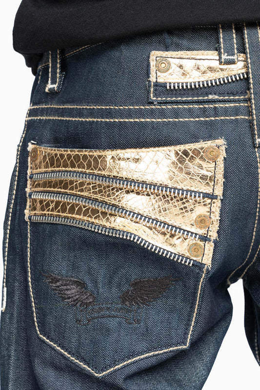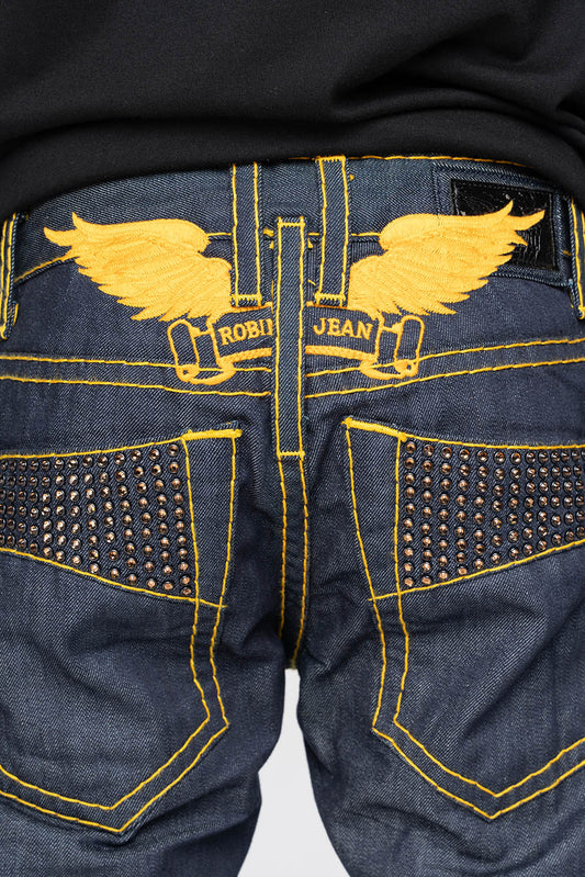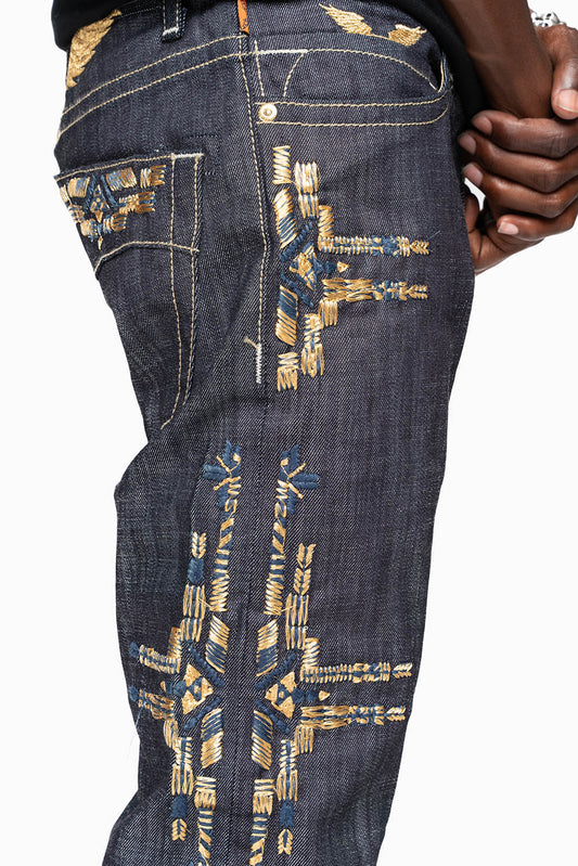 ROBIN’S MEN SLIM JEAN IN CHAPA GOLD INDIGO RAW DENIM WITH GOLD WING AND CHAPA EMBROIDERY