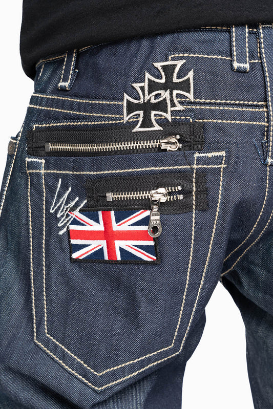 ROBIN’S BRITISH FLAG SLIM JEANS IN RAW DENIM EMBROIDERED ROBIN”S WING LOGO ON THE BACK WITH PATCHES