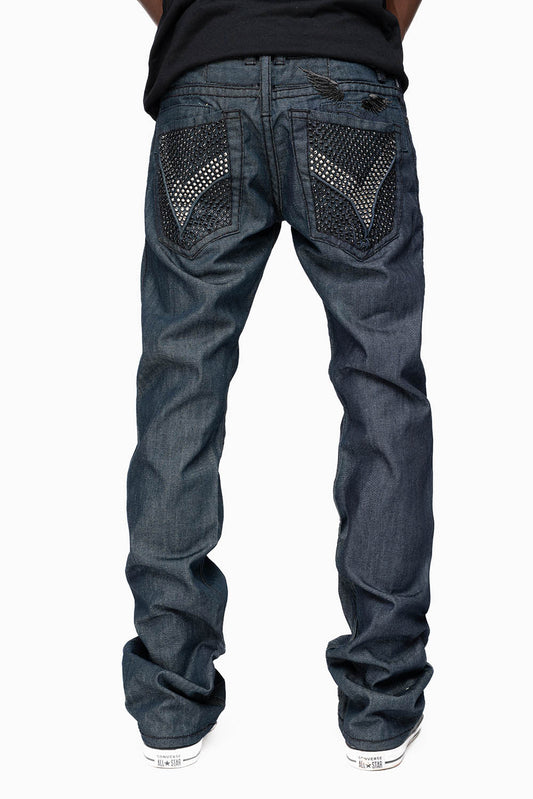 AMERICAN BEAUTY BOOT CUT JEAN IN VINTAGE DARK WITH EMBROIDERED WING LOGO AND EMBELISHMENT ON BACK POCKETS