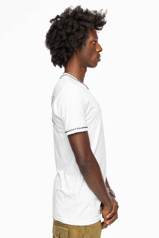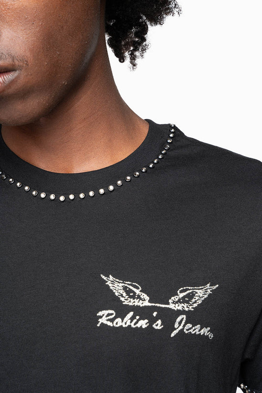 ROBIN’S LOGO WINGS WHITE TEE IN BLACK PRINT EMBELLISHED WITH BLACK DIAMOND CRYSTALS