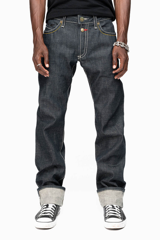 MENS CLASSIC 5 POCKET STRAIGHT LEG JEANS IN RAW DENIM WITH HEAVY ORANGE STITCHING