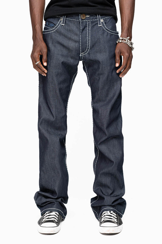 ROBIN’S BOOT CUT JEAN IN RAW DENIM WITH HEAVY WHITE STITCHING WITH EMBROIDERED WING LOGO ON BACK POCKETS