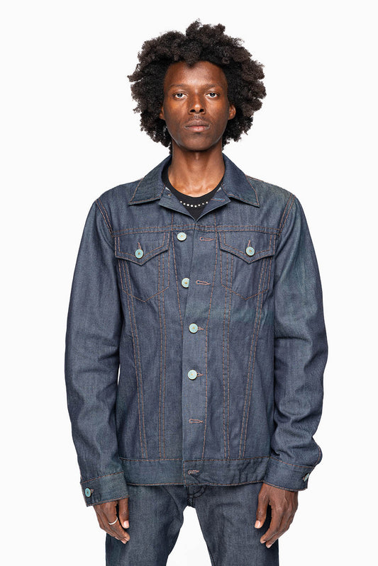MEN’S CLASSIC RAW DENIM JEAN JKT WITH HEAVY BROWN CONTRAST STITCHING AND ROBIN’S WING LOGO EMBROIDERY