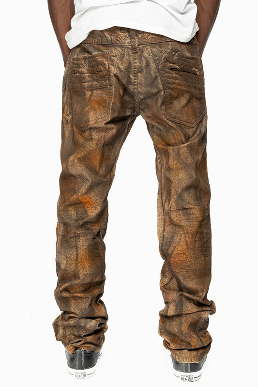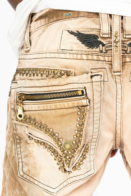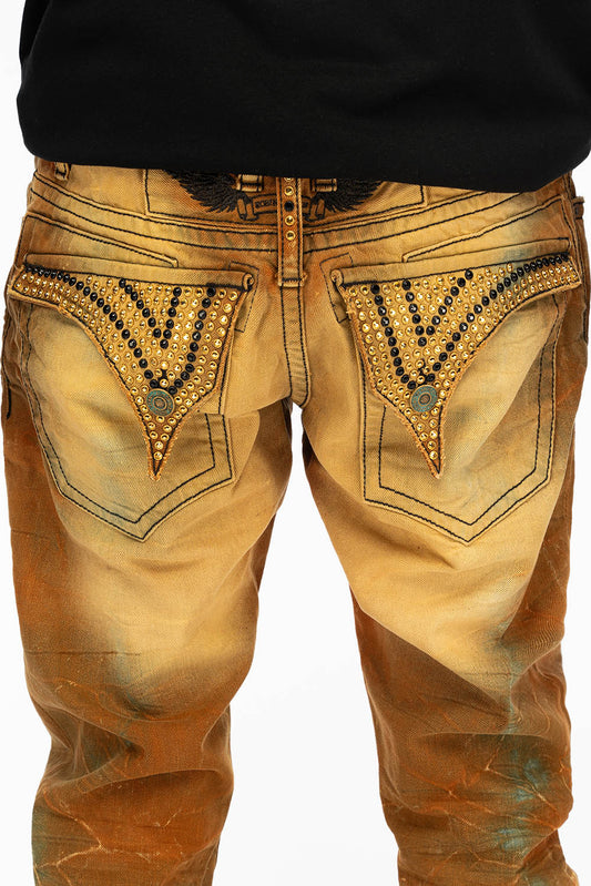 MINI FLAP MENS SLIM JEANS IN AMARETO DESTROY BACKING WITH CRYSTALS AND SPIKE