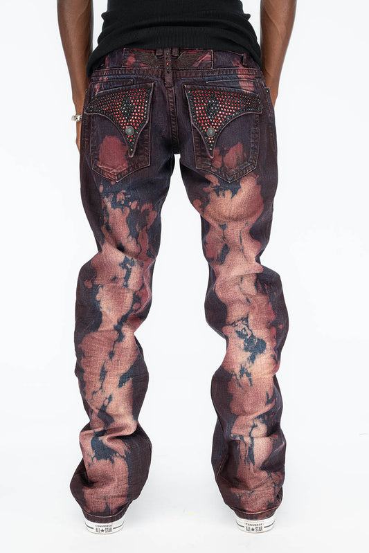 MENS LONG FLAP STRAIGHT CUT JEANS WITH CRYSTALS IN TIPPY RED WASH