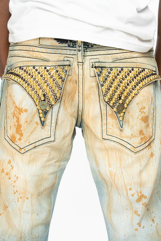 LONG FLAP MENS STRAIGHT JEANS WITH CRYSTALS IN DUSTY YELLOW