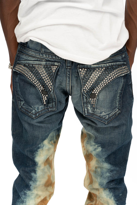 KILLER FLAP STRAIGHT LEG JEANS WITH CRYSTALS AND PYRAMID IN JUPITER BLUE SPECIALTY WASH