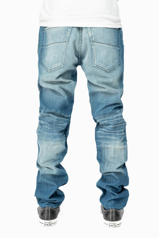 MENS MOTORCYCLE INSPIRED ZIPPERS SLIM JEANS IN JOSEPH INDIGO WASH WITH EMBELLISHMENT