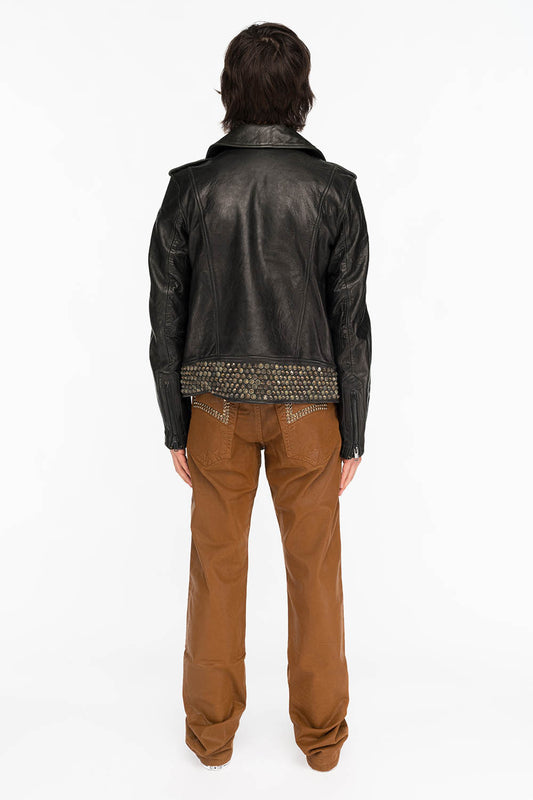 CLASSIC 5 POCKET STRAIGHT LEG JEANS IN CUIR CARAMEL WITH STUDS AND CRYSTALS