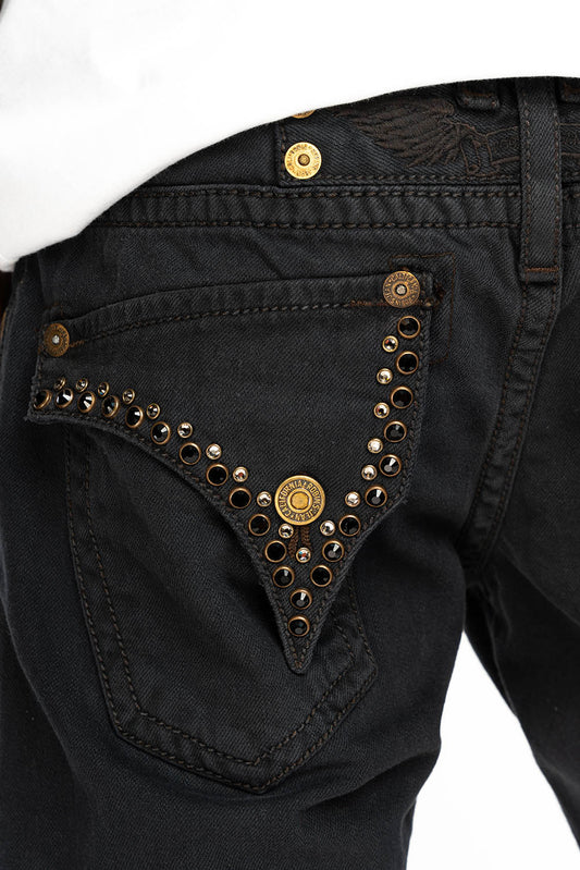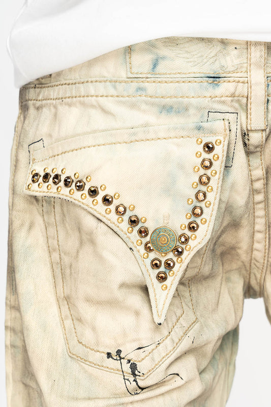 MENS DESTROYED SHORTS WITH KILLER FLAP POCKET IN JERONIMO WASH WITH STUDS AND CRYSTALS