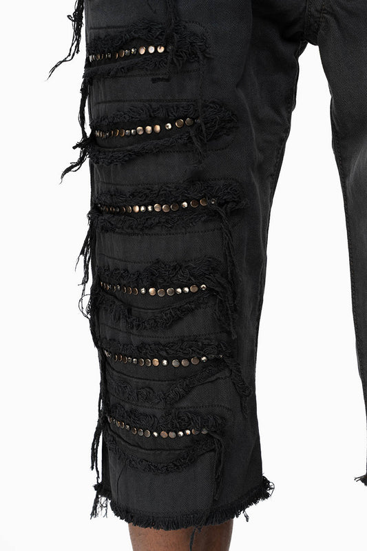 MENS DESTROYED SHORTS WITH KILLER FLAP POCKET IN BLACK WITH STUDS AND CRYSTALS