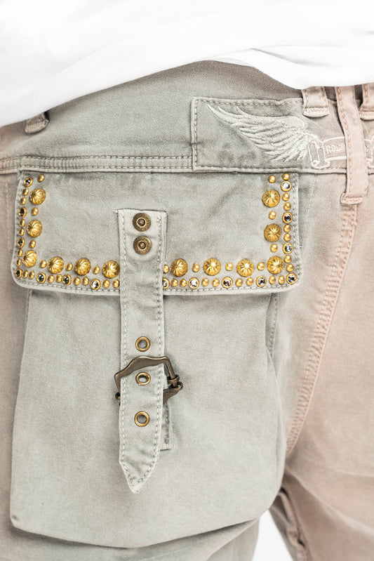 MEN'S MILITARY CARGO SHORTS WITH STUDS AND CRYSTALS IN CEMENT WASH