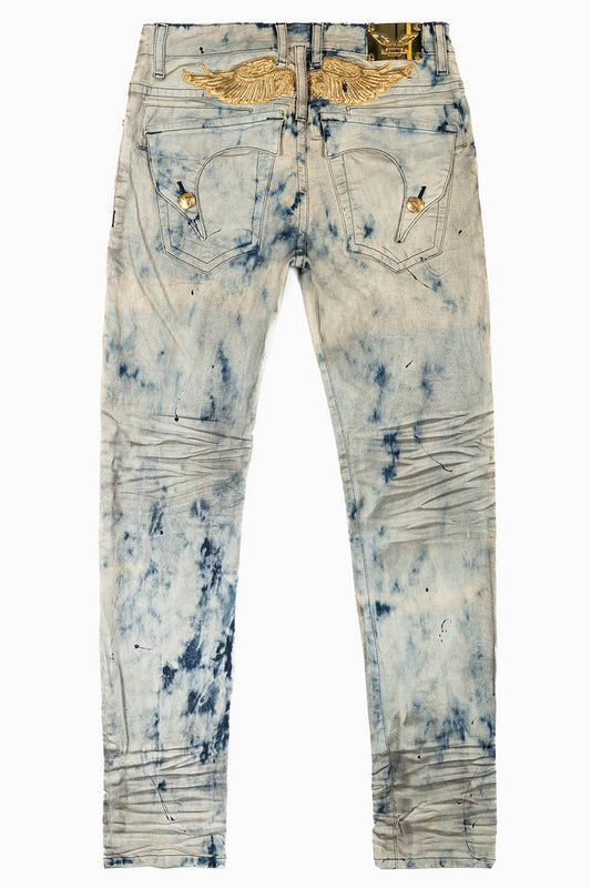 KILLER FLAP MENS SKINNY JEANS IN FROZEN WASH WITH GOLD WING EMBROIDERY