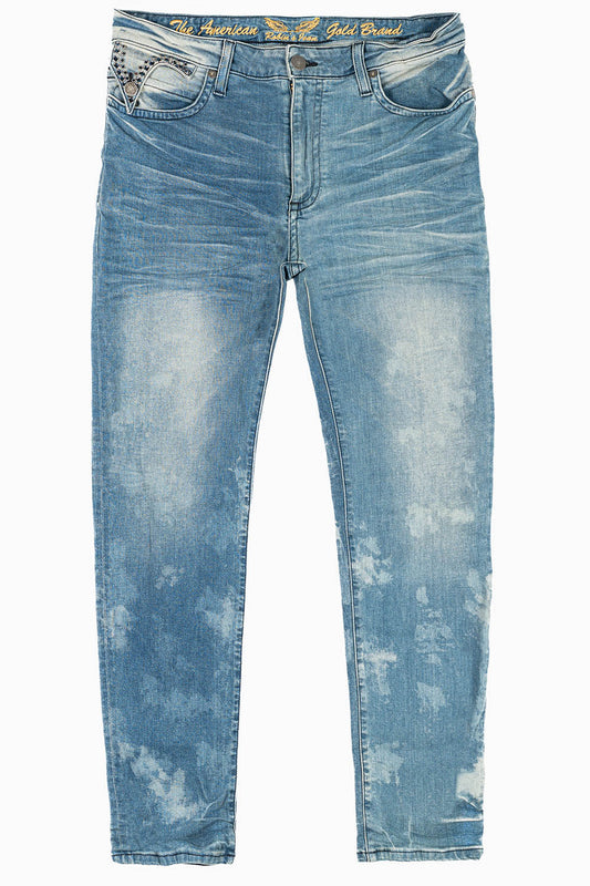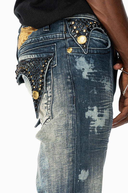 KILLER FLAP MENS SKINNY JEANS IN NEW JAPAN MEDIUM WASH WITH ANTIQUE BRASS PYRAMID STUDS AND AURUM CRYSTALS