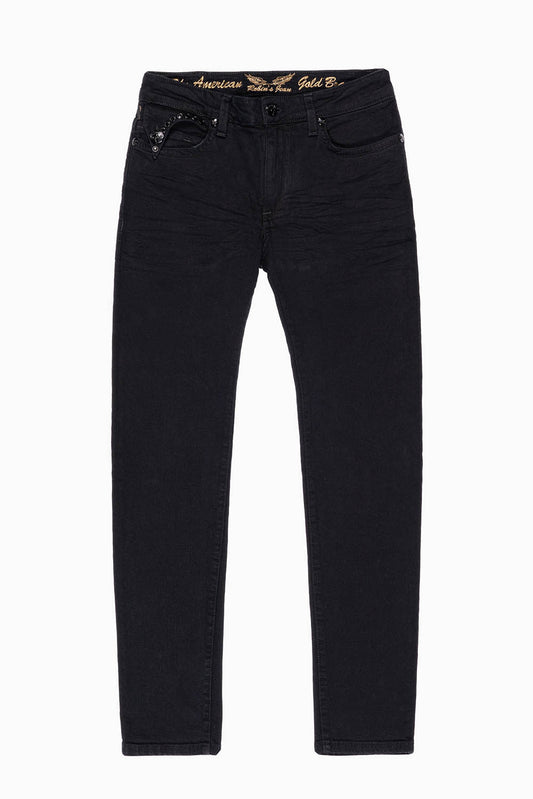 KILLER FLAP MENS SKINNY JEANS IN PURE BLK EMBELLISHED WITH CRYSTALS AND JEWEL BROOCH