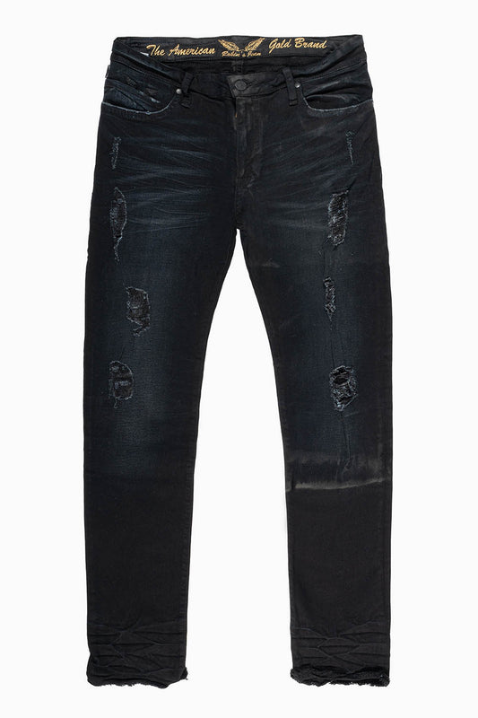 LONG FLAP MENS SKINNY JEANS IN BLUE 5D DARK BROKEN WASH WITH MONTANA BLUE CRYSTALS
