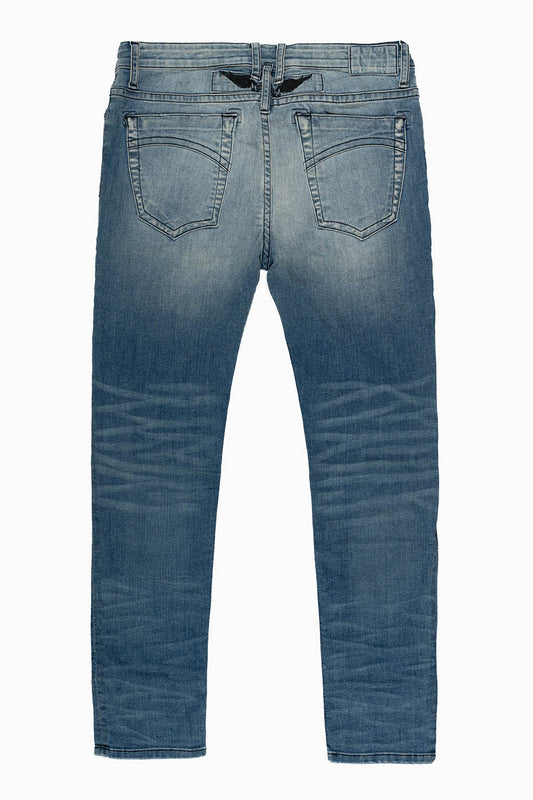 MENS SKINNY JEANS IN BLUE 4D LIGHT WASH WITH TONAL WING EMBROIDERY