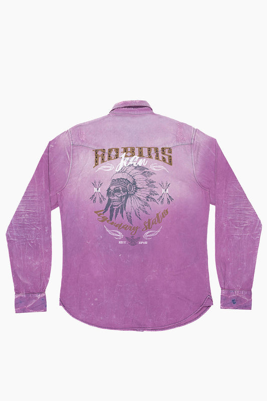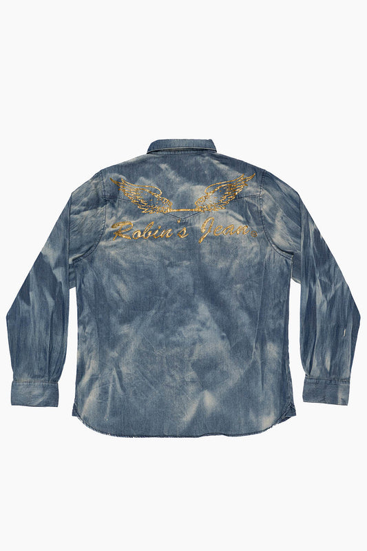 WESTERN NATIVE AMERICAN STYLE MENS DESTROY DENIM SHIRT IN MONTECITO EMBELLISHED WITH CRYSTALS AND STUDS