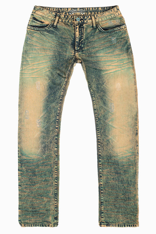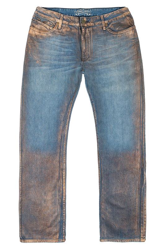 MENS LONG FLAP STRAIGHT CUT JEANS WITH CRYSTALS IN COPPER FOIL WASH