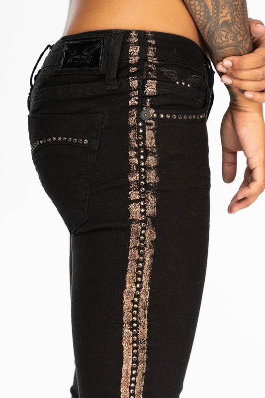 MARILYN WOMENS SKINNY JEANS IN BLACK WITH COPPER GLITTER TUXEDO STRIPE WITH SMOKEY TOPAZ CRYSTALS