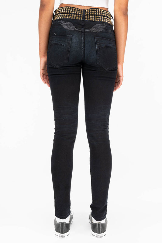 MARILYN WOMENS SKINNY JEANS IN BLACK WITH TONAL WINGS AND CRYSTALS