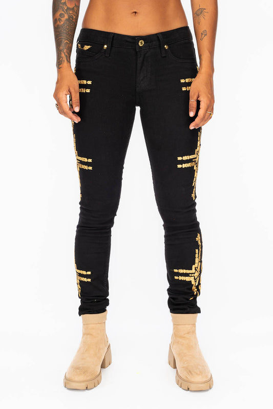 MID RISE WOMENS JEANS WITH GOLD EMBROIDERY IN LA BLACK