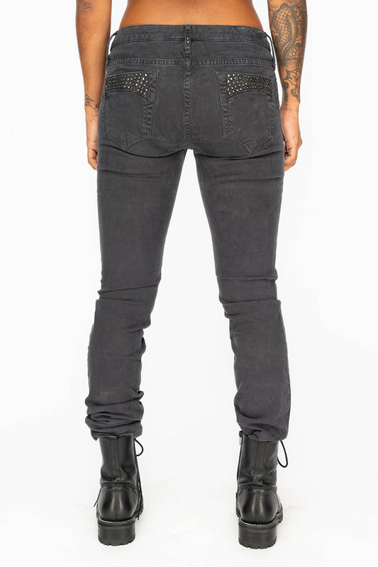JANE MID RISE WOMENS SKINNY JEANS IN CHARCOAL BLACK DIAMOND CRYSTALS