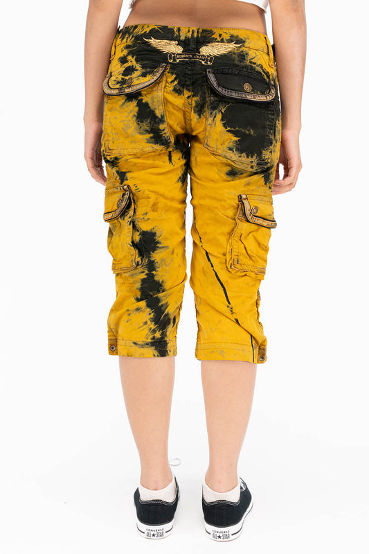 MILITARY STYLE WOMENS CARGO SHORTS IN TYE DYE YELLOW AND BLACK WASH