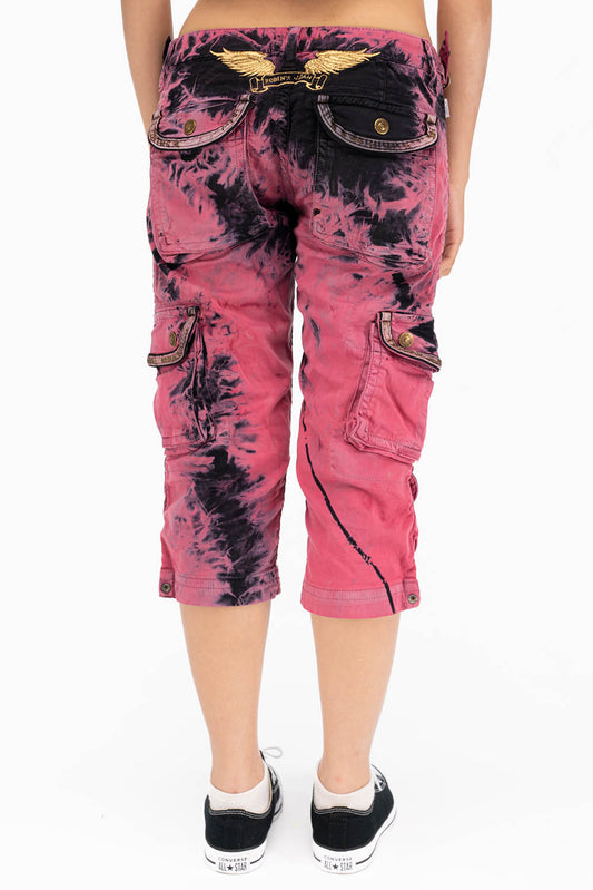 MILITARY STYLE WOMENS CARGO SHORTS IN TYE DYE PINK AND BLACK WASH
