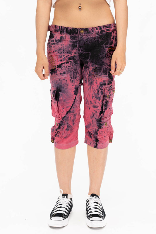 MILITARY STYLE ASSORTED PATCH WOMENS CARGO SHORTS IN TYE DYE PINK AND BLACK WASH