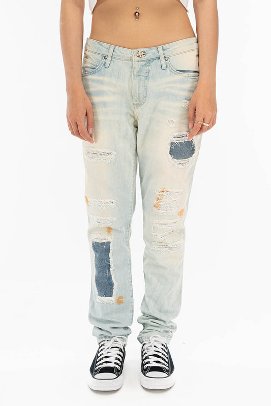 BOYFRIEND STYLE WOMENS PATCHED JEANS IN GEORGE WASH