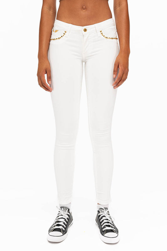 MARILYN WOMENS STUDDED SKINNY JEANS IN WHITE WITH GOLD WINGS AND GOLD STUDS AND CRYSTALS