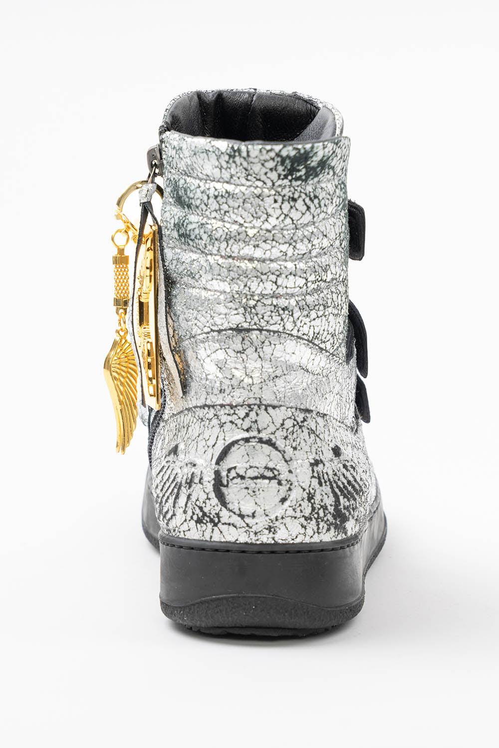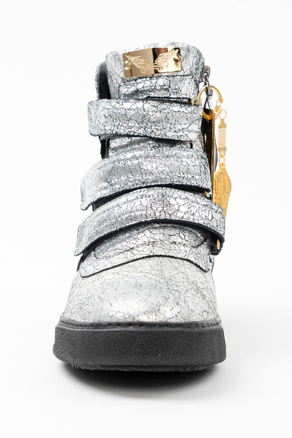 Robin's high top Velcro shoes in Crackled Silver leather, finished with gold plate logo Robin's wings.
